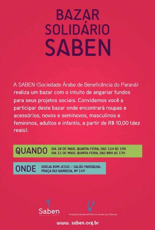 A Sociedade Árabe de Beneficência do Paraná (Saben) realiza nos dias 10 e 11 de Maio um bazar para arrecadar fundos para financiar as suas obras sociais. O dinheiro arrecadado durante o evento será revertido em doações para refugiados sírios que vivem em Curitiba e para entidades como o Espaço Fraterno Professora Neyda e o Lar Bom Caminho, entre outras.